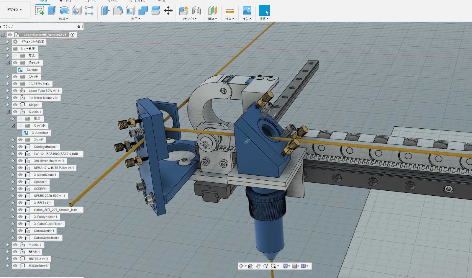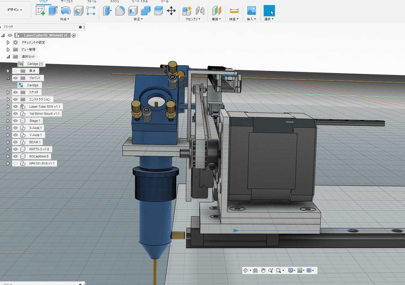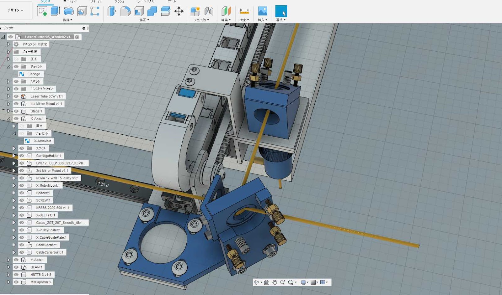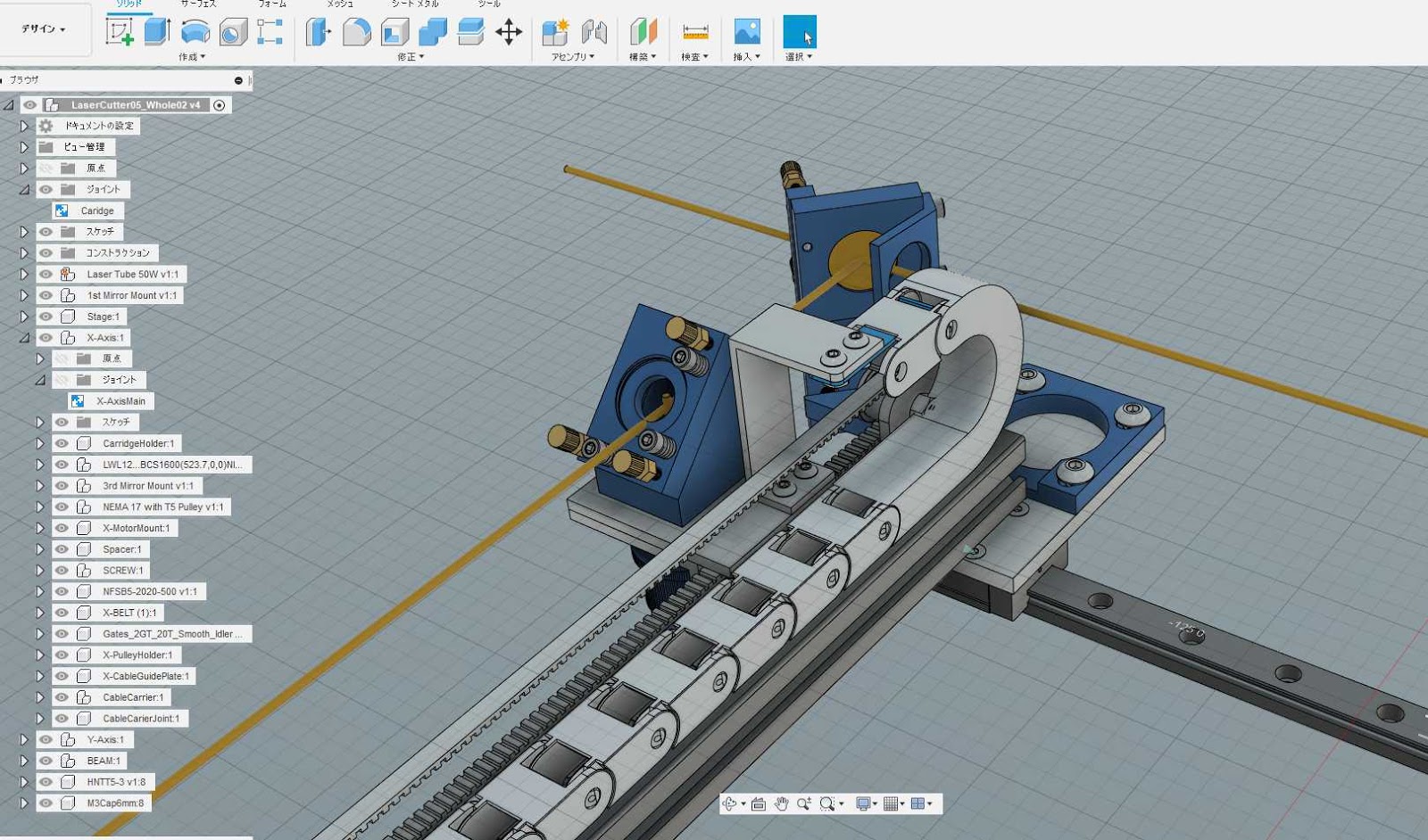 一番面倒なのはX軸です。縦にも横にも動く必要があり、レーザ管から一番離れるため光軸が長くなり、少しのずれが精度に大きく影響します。