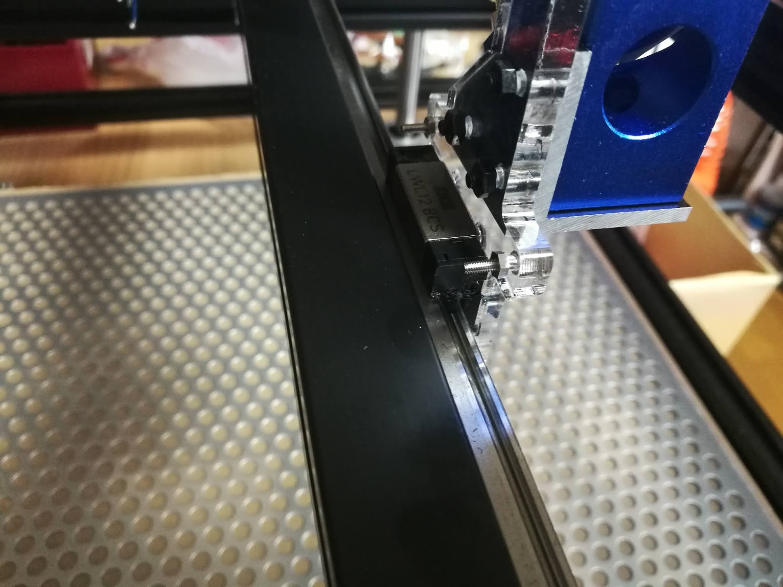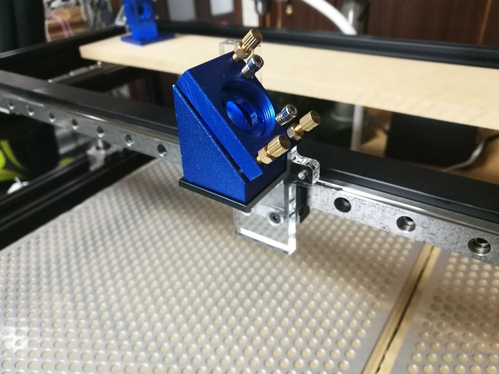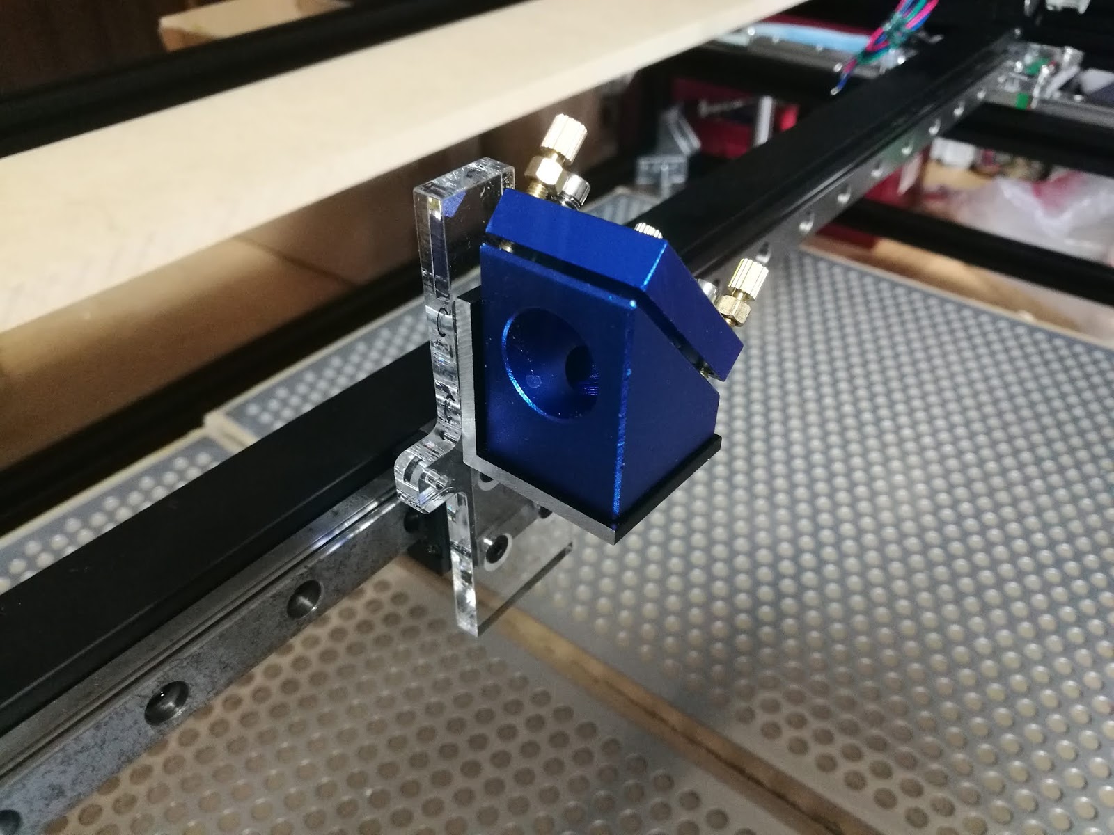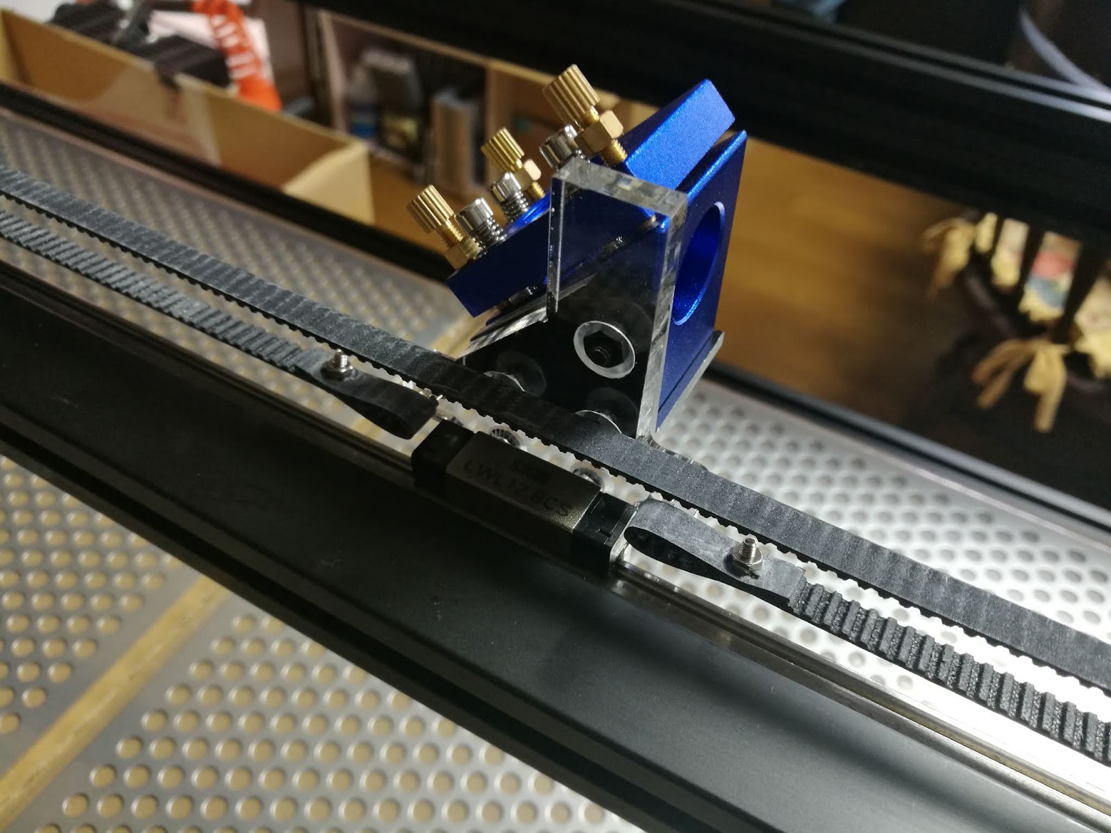 一番面倒なのはX軸です。縦にも横にも動く必要があり、レーザ管から一番離れるため光軸が長くなり、少しのずれが精度に大きく影響します。