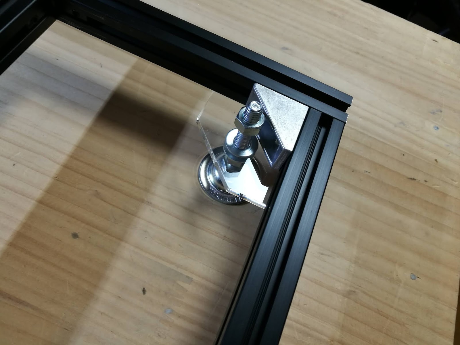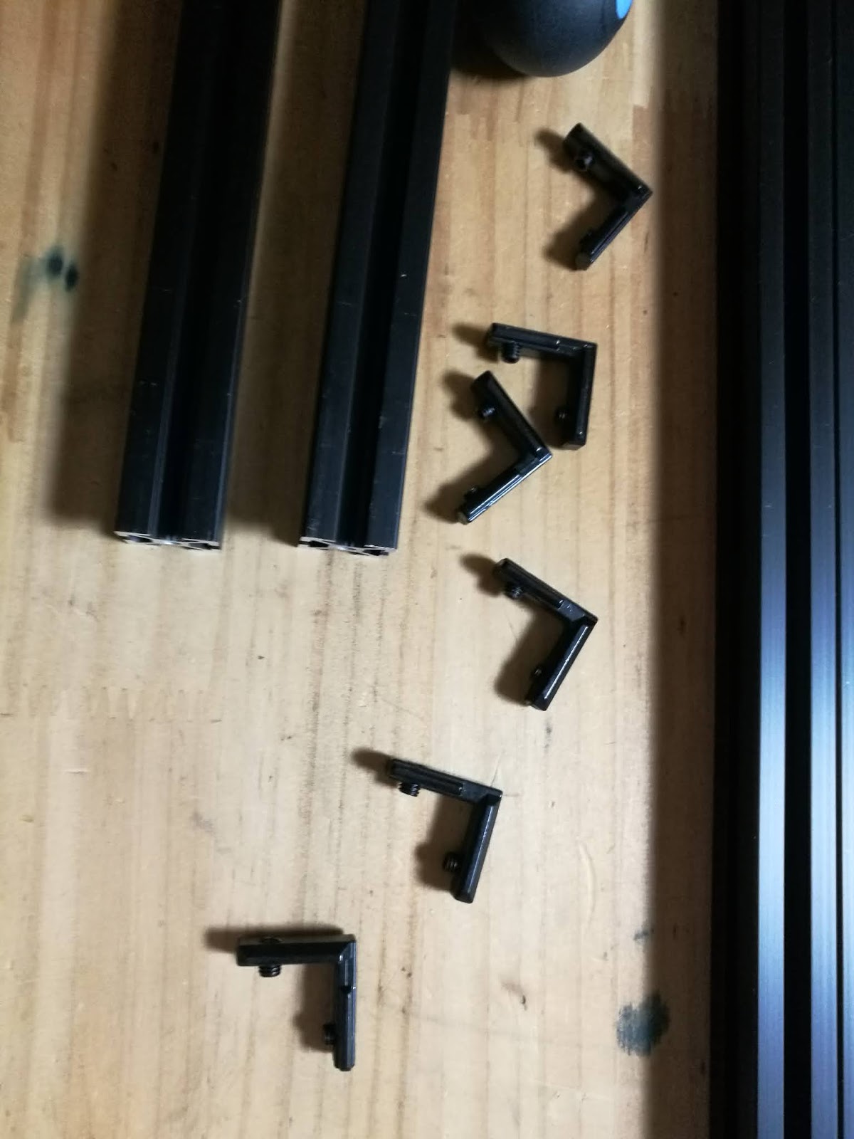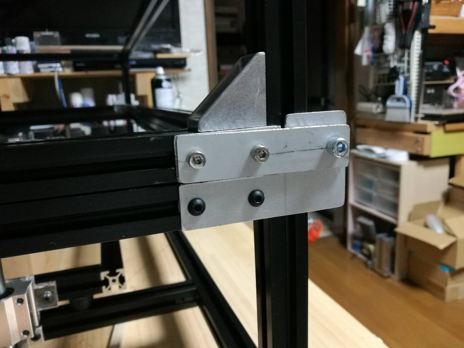 今回はこのフレームの中に隠れるブラケットも使っていきます。これを使うとコーナー部分に出っ張りというか三角形というか、ブラケットが出っ張らなくなりますので見た目もすっきりするし、ほかの部材の取り付けにも余裕ができます。