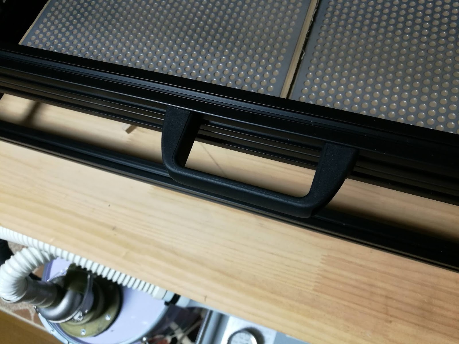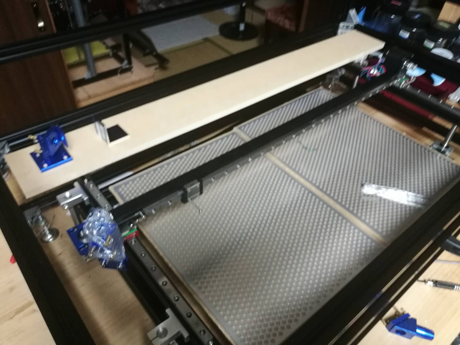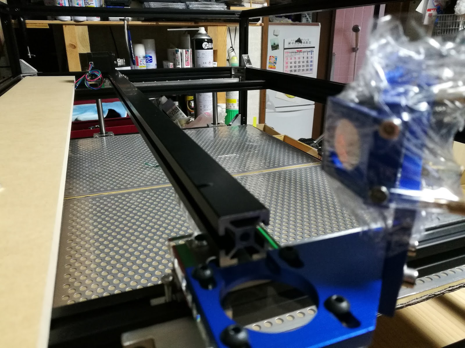 さて、ちゃんとした加工機であれば昇降ステージの上にはハニカム板が乗っかるはずですが、今回はそこまでの投資はしませんでした。これまでの加工機の経験からハニカムは特になくても困らないことが分かっているからです。