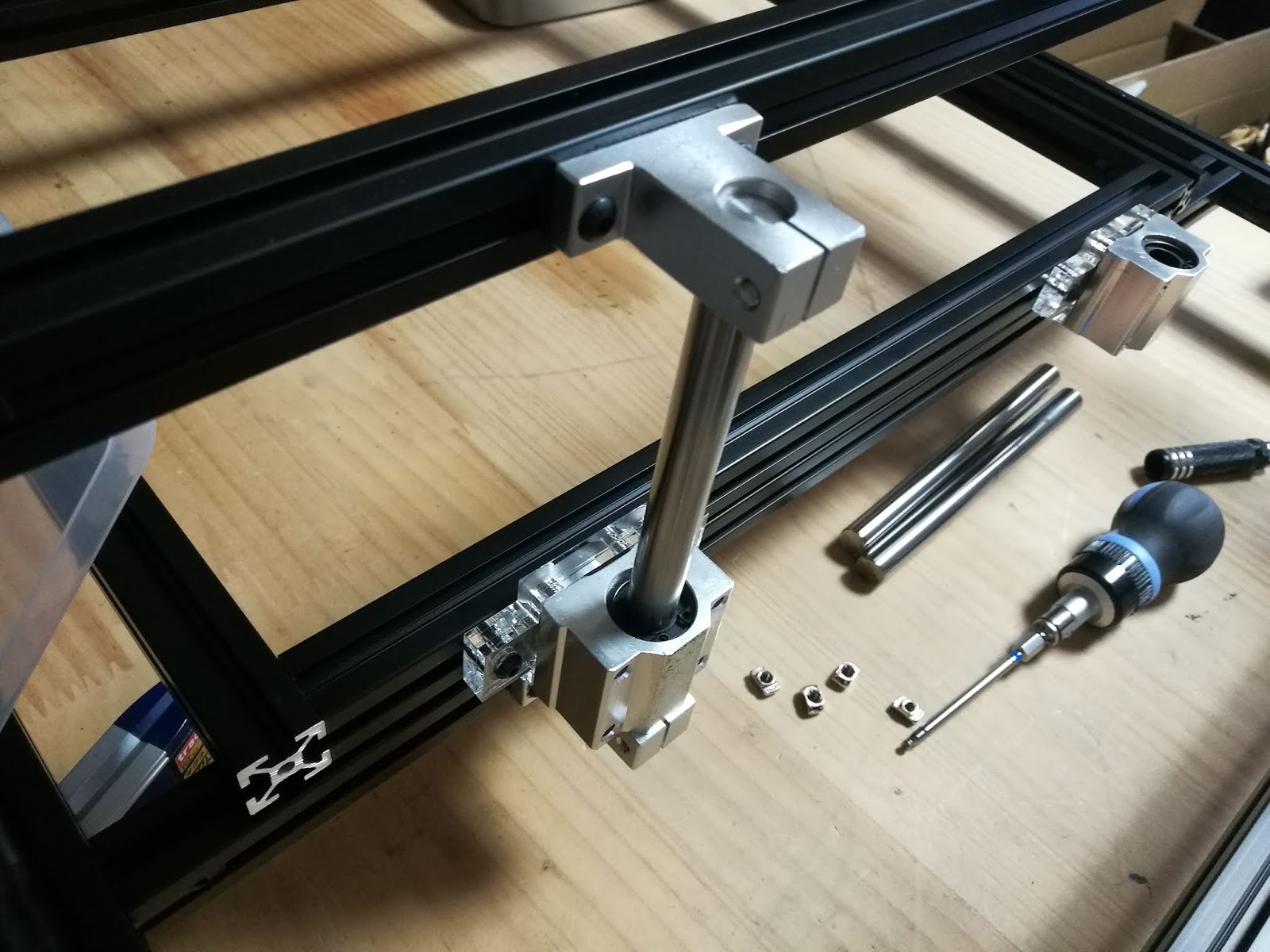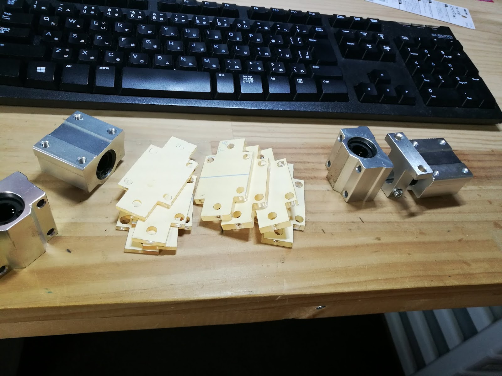 X軸とY軸にはリニアレールを使いますが、Z軸の昇降ステージについてはシャフトとリニアブッシュを使います。昇降ステージは加工時に動かすことは無いので、それほどの精度が要らないのであります。