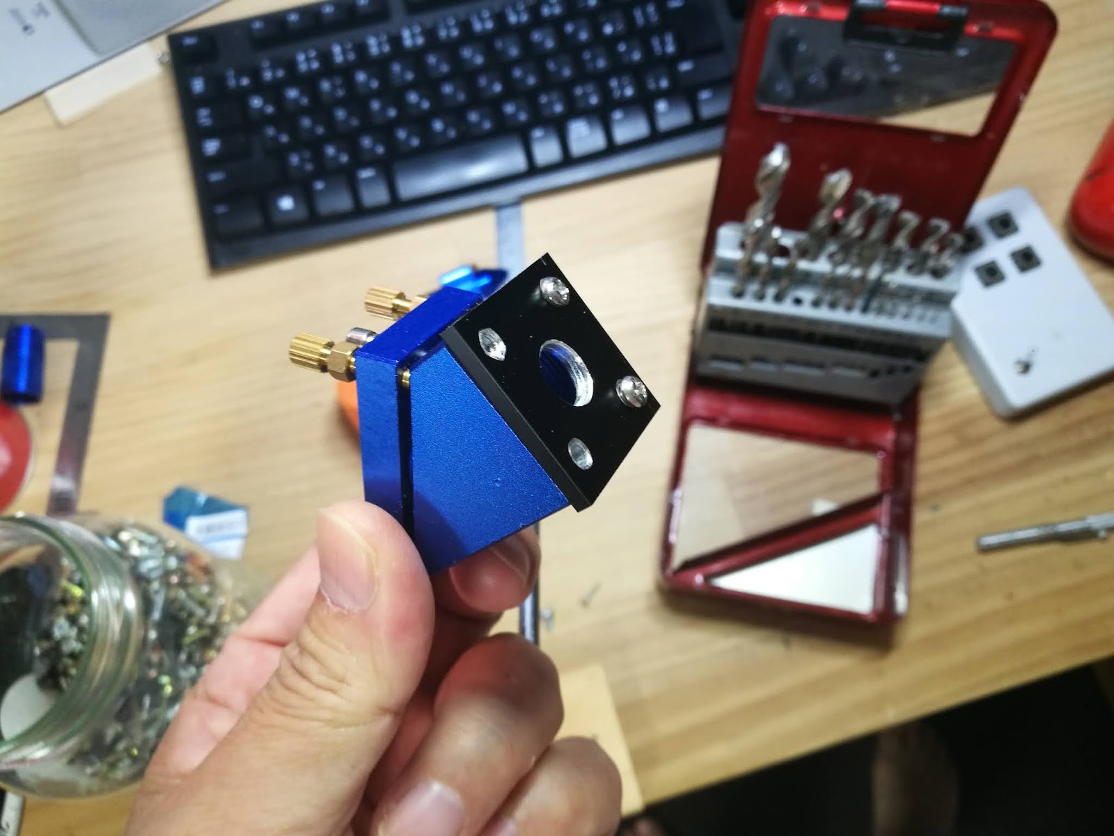 もちろんこの改造による弊害も出てきます。それはレンズが汚れやすくなるということです。鏡筒にはエア吹き付けのチューブが接続されており、圧縮空気を送ることで鏡筒先端から集光されたレーザビームと共にエアを吹き出すような構造になっています。こうすることでレーザ照射時にワークから出るガスや煙、飛び散るヤニなどがレンズに付着するのを防ぐようになっているのです。五号機でもエアアシストは実装しますが、この改造によってレンズが丸裸になりますので汚れに対してはかなり弱くなります。