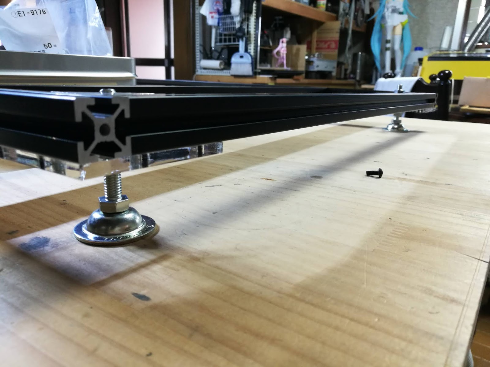 上下の枠の間は150mmの短いパーツでつないでいきますが、その前に底側のフレームにアジャスターを取り付けます。