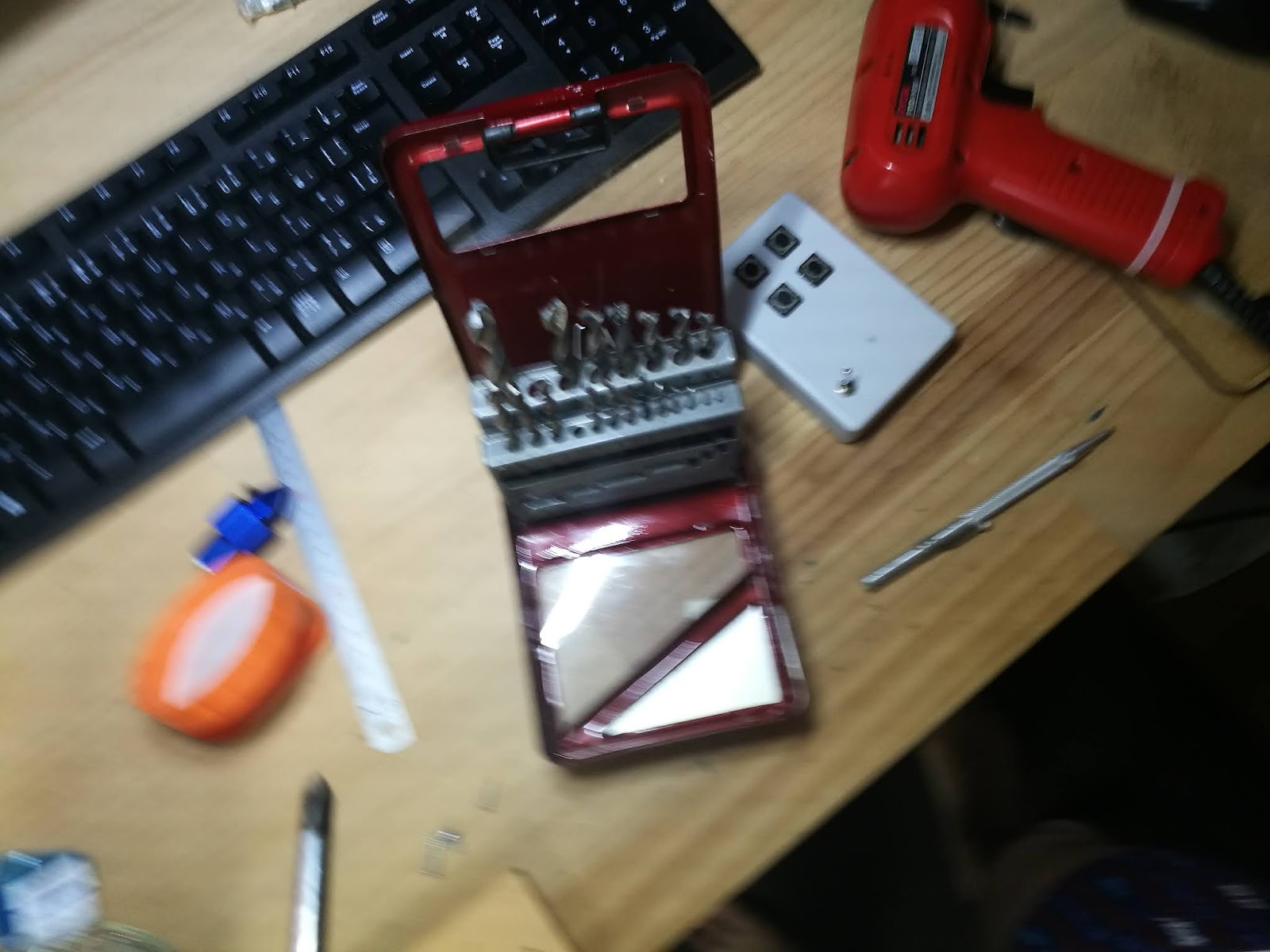 真ん中のビームが通る穴はもう少し余裕を持たせたいので、ハンドドリルで広げます。